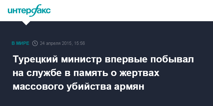 Москва. 24 апреля. INTERFAX.RU - Член правительства Турции в пятницу впервые посетил службу в память жертв массового убийства армян в 1915 году, а президент Реджеп Тайип Эрдоган вновь выразил соболезнования потомкам погибших, сообщают турецкие СМИ.