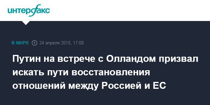 Москва. 24 апреля. INTERFAX.RU - Владимир Путин призвал Евросоюз предпринять шаги для восстановления отношений с Россией. Такое заявление он сделал в ходе встречи с президентом Франции Франсуа Олландом в Ереване.