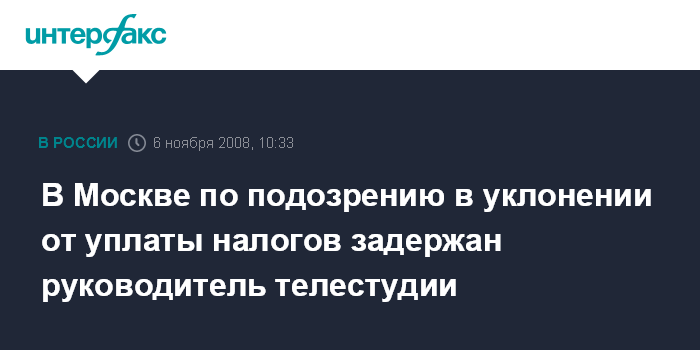 Собеседник агентства рассказал, что задержание происходило в офисе компании, занимающейся производством телевизионных программ, в среду днем в ходе отработки оперативной информации. По словам собеседника "Интерфакса", 42-летнего генерального директора компании подозревают в том, что он не заплатил налоги за 2001 год в сумме 29 млн 333 тыс. 885 рублей.