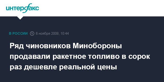 Москва. 6 ноября. INTERFAX.RU - Военная прокуратура выявила значительные хищения со стороны должностных лиц центральных управлений Минобороны России, которыми нанесен ущерб в 430 млн рублей. Как сообщил главный военный прокурор Сергей Фридинский, речь идет о перепродаже через коммерческие организации ракетного топлива по ценам, заниженным почти в 40 раз.