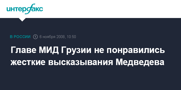 Москва. 6 ноября. INTERFAX.RU - Глава МИД Грузии Эка Ткешелашвили считает, что содержание ежегодного послания президента РФ Димитрия Медведева Федеральному собранию было "агрессивным".