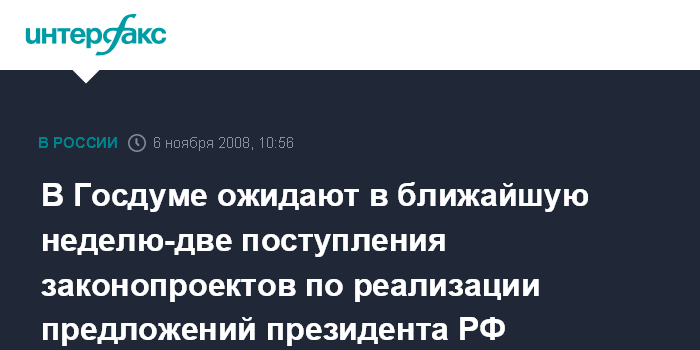 Москва. 6 ноября. INTERFAX.RU - Законопроекты, направленные на реализацию предложений президента, выдвинутых Дмитрием Медведевым в ежегодном послании Федеральному собранию, могут быть внесены в Госдуму в самое ближайшее время - в течение одной-двух недель, сообщил спикер Борис Грызлов.