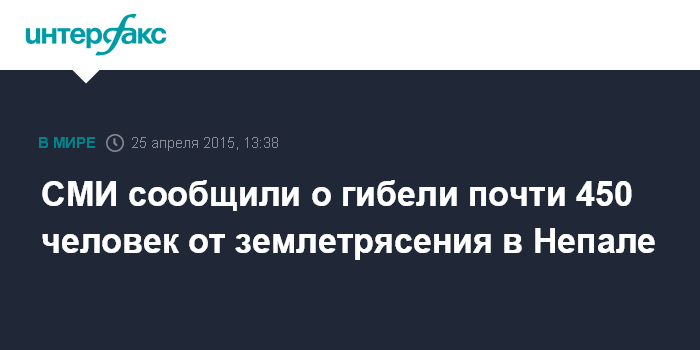 Москва. 25 апреля. INTERFAX.RU - 449 человек погибли в Непале из-за произошедшего в субботу мощного землетрясения, сообщают западные СМИ со ссылкой на непальскую полицию.