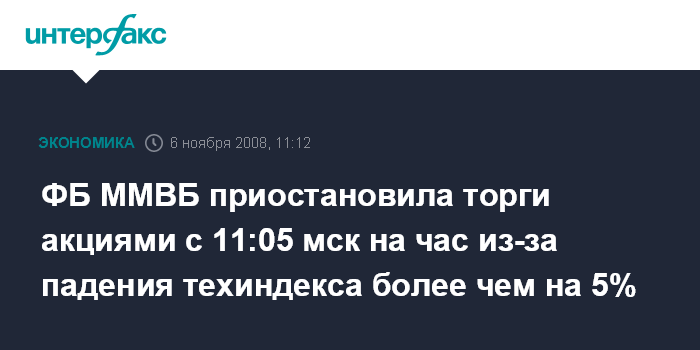 Москва. 6 ноября. INTERFAX.RU - Фондовая биржа ММВБ в четверг приостановила торги всеми акциями с 11:05 МСК на час из-за падения технического индекса биржи более чем на 5% к уровню закрытия предыдущего дня, сообщила биржа. К 11:00 мск технический индекс ММВБ упал на 6,83% - до 895,84 пункта.