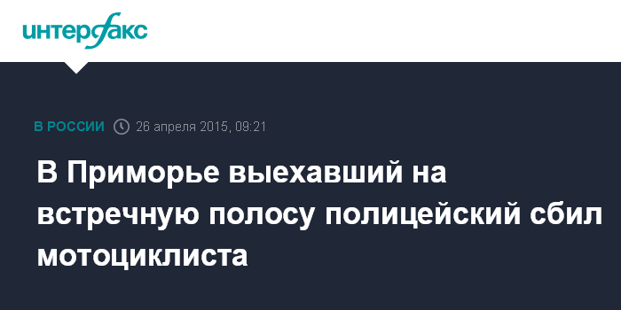 Москва. 26 апреля. INTERFAX.RU - Служебная проверка проводится в Приморье по факту ДТП с участием сотрудника полиции, в котором погиб пожилой мотоциклист.