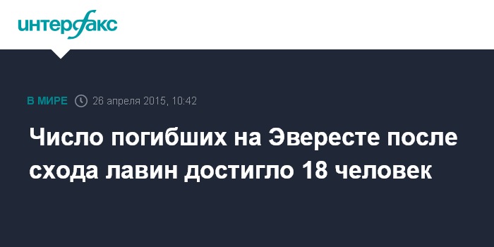Москва. 26 апреля. INTERFAX.RU - Индийские спасатели нашли тела 18 туристов, альпинистов, которые погибли в субботу на горе Эверест, утверждает The Times of India. Несколько лавин сошли на самой высокой горе мира после землетрясения, которое произошло в Непале.