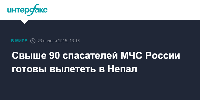 Москва. 26 апреля. INTERFAX.RU - Более 90 спасателей МЧС России готовятся к вылету в Непал для участия в ликвидации последствий сильного землетрясения. На аэродроме Раменское в подмосковном Жуковском осуществляется загрузка двух самолетов МЧС Ил-76.