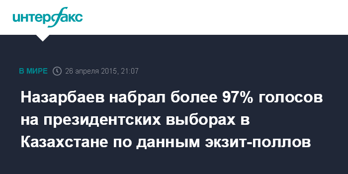 Москва. 26 апреля. INTERFAX.RU - Действующий президент Казахстана Нурсултан Назарбаев на президентских выборах 26 апреля получил 97,5% голосов избирателей, сообщило объединение юридических лиц (ОЮЛ) "Гражданский альянс Казахстана", проводивший экзит-полл.