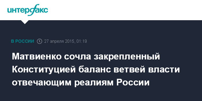 Москва. 27 апреля. INTERFAX.RU - Председатель Совета Федерации Валентина Матвиенко считает, что заложенный в Конституции РФ принцип разделения властей отвечает реалиям России.