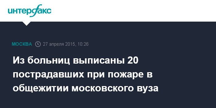 Москва. 27 апреля. INTERFAX.RU - Врачи выписали из больниц 20 из 36 человек, пострадавших в результате пожара в общежитии медицинского университета имени Пирогова в Москве, сообщили "Интерфаксу" в департаменте здравоохранения Москвы.