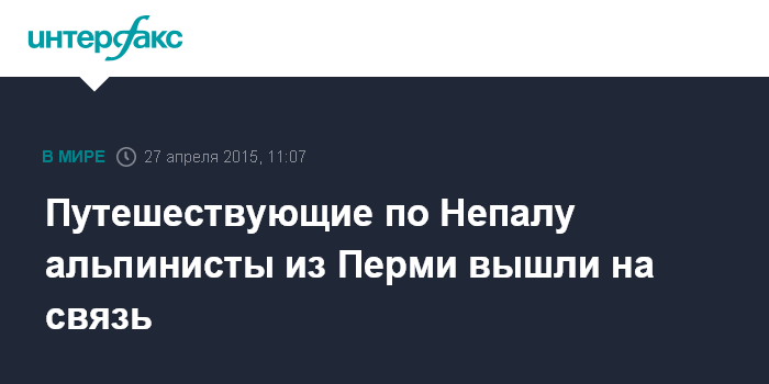 Москва. 27 апреля. INTERFAX.RU - Супруги-альпинисты из Пермского края, которые путешествовали по Непалу и с которыми ранее не было связи, сообщили на своей странице в соцсети, что с ними все в порядке, сообщили "Интерфаксу" в пресс-службе ГУ МЧС по Пермскому краю.