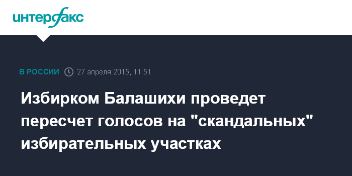Москва. 27 апреля. INTERFAX.RU - Мособолизбирком попросил территориальную избирательную комиссию (ТИК) Балашихи пересчитать голоса на избирательных участках восьмого округа города, откуда поступали сообщения о нарушениях, сообщил глава ведомства Ирек Вильданов.