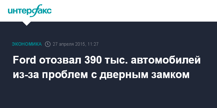 Москва. 27 апреля. INTERFAX.RU – Американская Ford Motor отозвала около 390 тыс. автомобилей из-за проблемы с дверным замком, которая может привести к открытию двери во время движения.