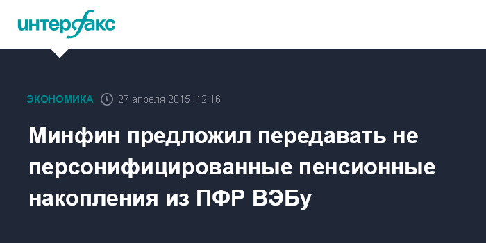 Москва. 27 апреля. INTERFAX.RU – Минфин предлагает направлять не персонифицированные средства страховых взносов на финансирование накопительной пенсии, поступающие в течение года в Пенсионный фонд, в отдельный инвестиционный портфель ВЭБа, сообщил агентству "Интерфаксу" источник, знакомый с предложением Минфина.