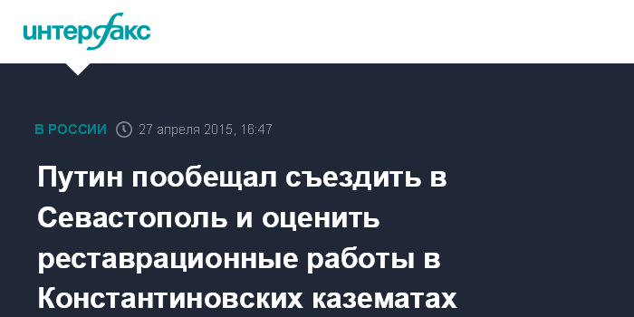 Москва. 27 апреля. INTERFAX.RU - Президент России Владимир Путин запланировал поездку в Севастополь, чтобы ознакомиться с ходом реставрационных работ в Константиновских казематах.