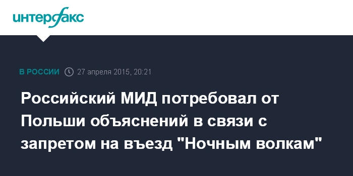 Москва. 27 апреля. INTERFAX.RU - В Москве возмущены отказом Польши во въезде группе российских байкеров, которые проводят мотопробег, посвященный 70-летию Победы над фашизмом.