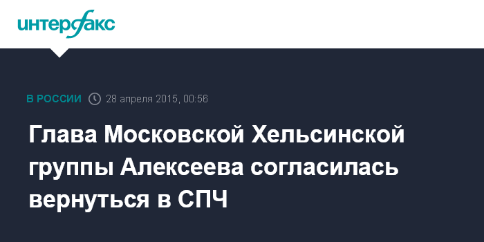 Москва. 28 апреля. INTERFAX.RU - Глава старейшей в России независимой правозащитной организации - Московской Хельсинской группы (МХГ) Людмила Алексеева - после трехлетнего перерыва может вернуться в состав Совета при президенте по развитию гражданского общества и правам человека (СПЧ). Об этом пишут "Известия" со ссылкой на высокопоставленного чиновника.