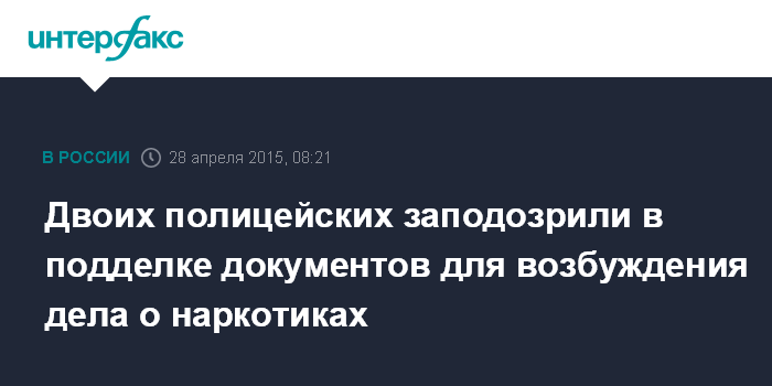 Москва. 28 апреля. INTERFAX.RU – Двое столичных оперативников подозреваются в фабрикации документов, на основании которых было возбуждено уголовное дело о незаконном обороте наркотиков, сообщили "Интерфаксу" в пресс-службе московской полиции.