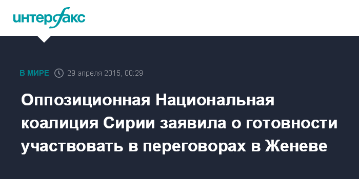 Москва. 29 апреля. INTERFAX.RU - Сирийская оппозиционная Национальная коалиция заявила о намерении участвовать в стартующих 4 мая в Женеве консультациях о путях урегулирования вооруженного конфликта в Сирии.
