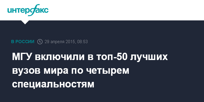 "МГУ имени М.В. Ломоносова подтвердил лидирующие позиции в международных рейтингах, заняв 35-е место по специальности "лингвистика", 36-е место по специальности "физика и астрономия" (улучшил результат 2014 года на 13 позиций), 42-е место по специальности "математика" (улучшил результат 2014 года на семь позиций), 48-е место по специальности "современные языки")", - говорится в пресс-релизе университета, поступившем в среду в "Интерфакс".