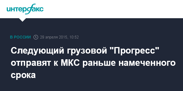"Запуск следующего "Прогресса" может быть осуществлен раньше плана в связи с потерей апрельского корабля", - сообщил собеседник агентства.