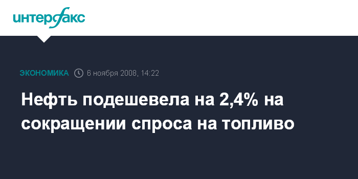 Москва. 6 ноября. INTERFAX.RU - Нефть подешевела на 2,4% на сокращении спроса на топливо, сообщило агентство Bloomberg.