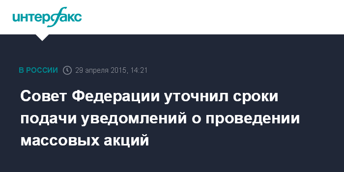 Москва. 29 апреля. INTERFAX.RU - Члены Совета Федерации одобрили в среду правительственный закон, уточняющий нормы о сроках подачи уведомления о проведении публичного мероприятия.