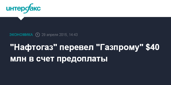 Москва. 29 апреля. INTERFAX.RU - НАК "Нафтогаз Украины" перевел ОАО "Газпром" еще $40 млн в счет предоплаты за поставки газа, сообщили агентству "Интерфакс-Украина" в пресс-службе компании.