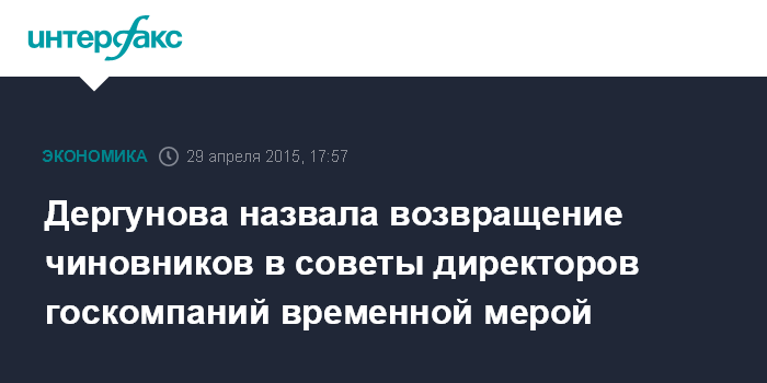 Москва. 29 апреля. INTERFAX.RU – Возвращение чиновников в советы директоров госкомпаний - это временная мера на период кризиса, заявила журналистам глава Росимущества Ольга Дергунова.
