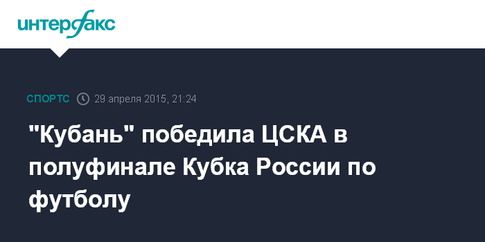 Москва. 29 апреля. INTERFAX.RU - "Кубань" дома обыграла ЦСКА в матче 1/2 финала Кубка России по футболу. Встреча закончилась со счетом 0:0 (1:0). На 71-й минуте гол забил Уго Алмейда.