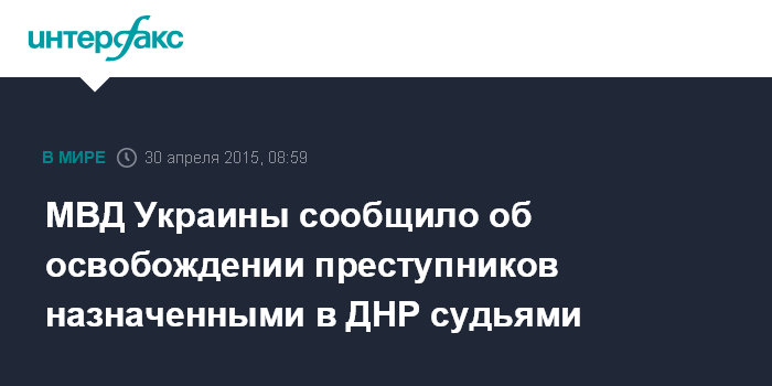 Москва. 30 апреля. INTERFAX.RU - Судьи, назначенные властями самопровозглашенной Донецкой народной республики, досрочно выпускают преступников, отбывающих наказание в местах лишения свободы на неподконтрольных украинским властям территориях, сообщает начальник ГУ МВД Украины в Донецкой области Вячеслав Аброськин.