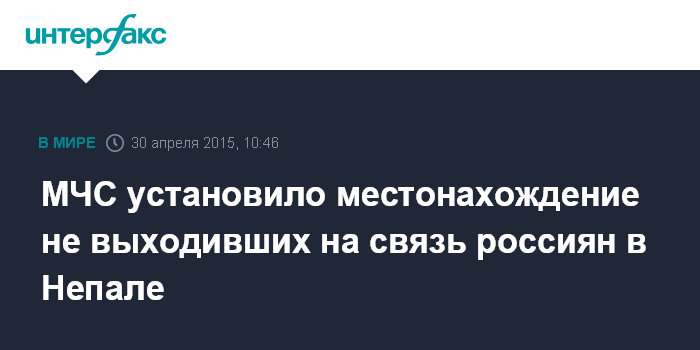 Москва. 30 апреля. INTERFAX.RU - МЧС России установило местонахождение 40 россиян в Непале, которые длительное время не выходили на связь, заявил замглавы МЧС России Владимир Степанов, отвечая на вопрос "Интерфакса".