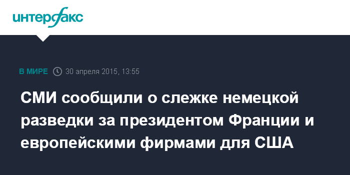 Москва. 30 апреля. INTERFAX.RU - Федеральная разведывательная служба Германии (БНД), по некоторым данным, шпионила за французскими чиновниками и штаб-квартирой ЕС по просьбе американской разведки, сообщает в четверг "Би-би-си".