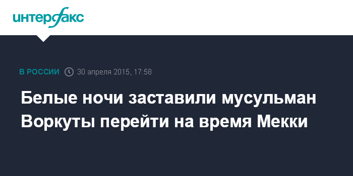 Москва. 30 апреля. INTERFAX.RU - Мусульмане Воркуты впервые перейдут на мекканское время из-за белых ночей, сообщили "Интерфаксу" в местной общине.