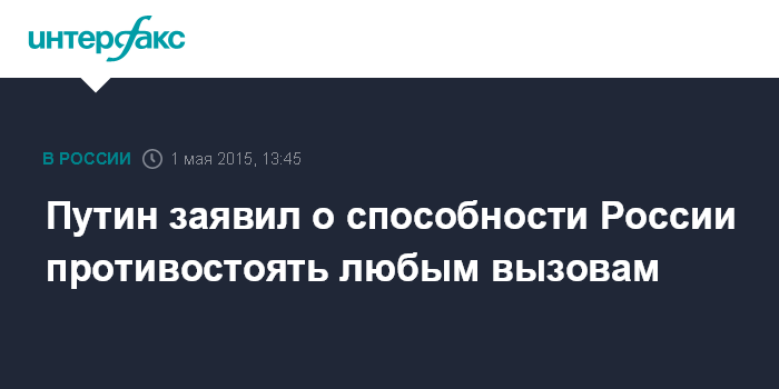 Москва. 1 мая. INTERFAX.RU - Россия может противостоять любым вызовам, заявил в пятницу президент РФ Владимир Путин на церемонии вручения золотых медалей "Герой Труда РФ" в Кремле.
