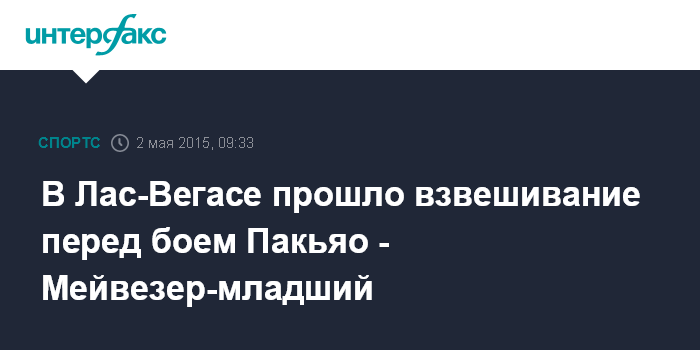 Москва. 2 мая. INTERFAX.RU - В пятницу в Лас-Вегасе состоялась процедура взвешивания перед поединком за титулы чемпиона мира по версиям WBA (Super), WBC и WBO в полусреднем весе. За пояса будут сражаться Мэнни Пакьяо и Флойд Мейвезер-младший.
