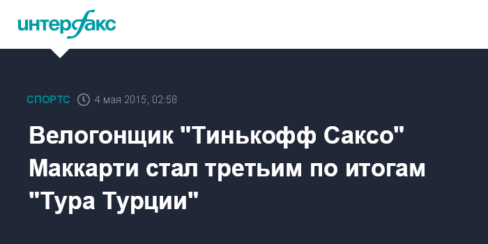 Москва. 4 мая. INTERFAX.RU - Австралиец Джей Маккарти, защищающий цвета российской команды "Тинькофф Саксо", занял итоговое третье место в генеральной классификации веломногодневки "Тур Турции".