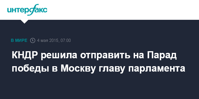 Москва. 4 мая. INTERFAX.RU - Северную Корею на празднествах по случаю 70-й годовщины Победы в Москве будет представлять председатель президиума Верховного народного собрания (ВНС) КНДР Ким Ен Нам. Об этом сообщает Центральное телеграфное агентство Кореи (ЦТАК).