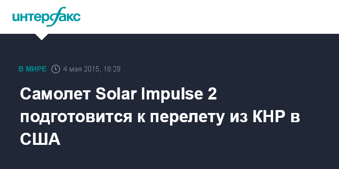 Москва. 4 мая. INTERFAX.RU - Швейцарский самолет Solar Impulse 2, работающий на солнечной энергии, как ожидается, на этой неделе начнет сложнейший перелет из Китая в США, сообщают в понедельник французские СМИ.