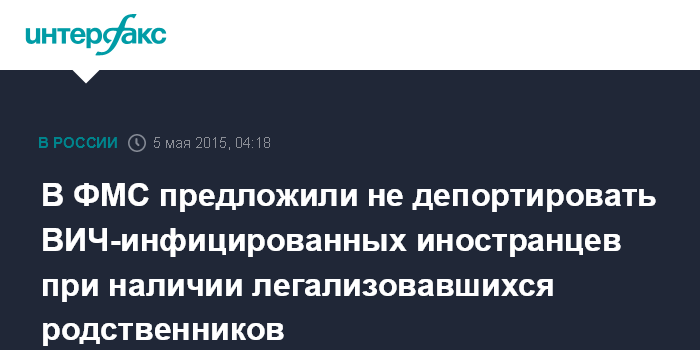 Москва. 5 мая. INTERFAX.RU - Федеральная миграционная служба (ФМС) выступила с инициативой не депортировать иностранных граждан, имеющих вирус иммунодефицита человека (ВИЧ), если у них на законных основаниях проживают в РФ члены семьи, пишет газета "Ведомости".