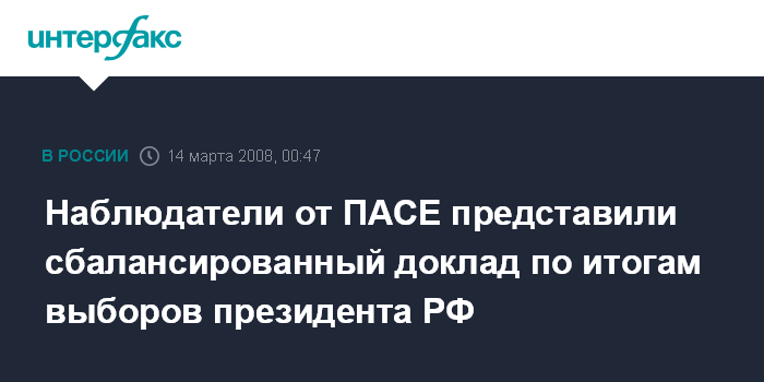 Москва. 14 марта. ИНТЕРФАКС - Глава российской делегации в Парламентской Ассамблее Совета Европы, председатель комитета Госдумы РФ по международным делам Константин Косачев отмечает сбалансированность представленного наблюдателями от ПАСЕ развернутого доклада по итогам президентских выборов в России.