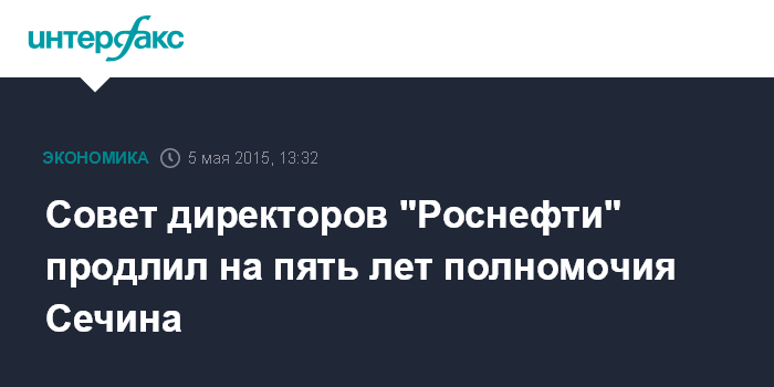 Москва. 5 мая. INTERFAX.RU – Совет директоров "Роснефти" продлил на пять лет полномочия Игоря Сечина в качестве президента компании, говорится в сообщении "Роснефти".