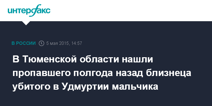 Москва. 5 мая. INTERFAX.RU - Во время поиска четырехлетнего мальчика, который пропал в удмуртском городе Глазове в апреле и был найден мертвым 2 мая, сотрудники полиции нашли его брата-близнеца, сообщил во вторник глава МВД по Удмуртии Александр Первухин.