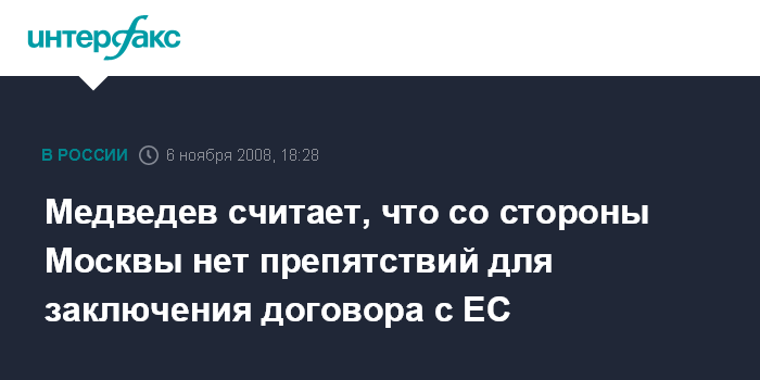 Москва. 6 ноября. INTERFAX.RU - Президент РФ Дмитрий Медведев заявил об отсутствии со стороны России препятствий для подписания с Евросоюзом нового базового соглашения.