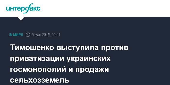 Москва. 6 мая. INTERFAX.RU - Лидер фракции "Батькивщина" в Верховной раде, экс-премьер Украины Юлия Тимошенко критикует планы приватизации государственных монополий и выступает категорически против продажи земли сельскохозяйственного назначения.