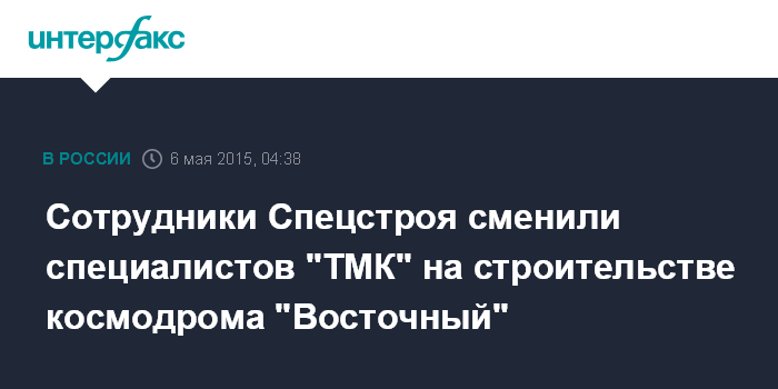 Москва. 6 мая. INTERFAX.RU - Спецстрой России быстро нашел замену специалистам ЗАО "ТМК", не завершившим строительно-монтажные работы на космодроме "Восточный", направив на объекты высококвалифицированных сотрудников Южного главка агентства, сообщили в штабе строительства космодрома.