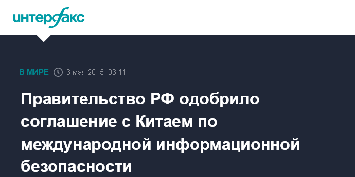 Кроме того, в правительстве заявляют, что соглашение отвечает интересам и позиции России в области обеспечения международной информационной безопасности, укрепляет российско-китайское стратегическое партнерство, и его подписание будет способствовать развитию взаимовыгодного сотрудничества между РФ и КНР.