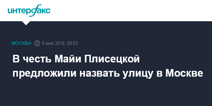 Москва. 6 мая. INTERFAX.RU - Депутат Госдумы Александр Агеев обратился к мэру столицы Сергею Собянину с предложением назвать одну из улиц Москвы в честь легендарной балерины Майи Плисецкой, скончавшейся 2 мая на 90-м году жизни, сообщает газета "Известия" в среду.