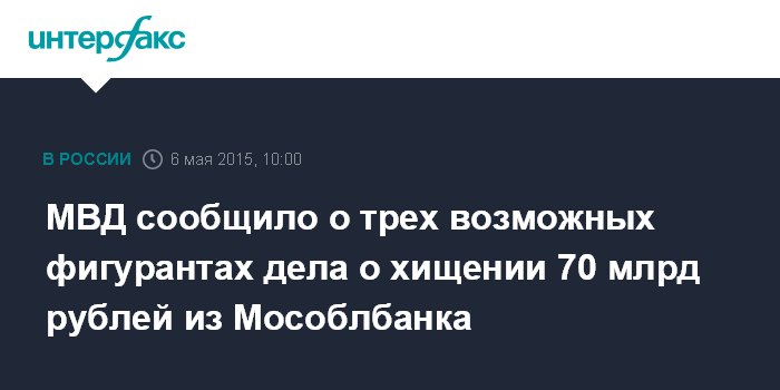 МВД сообщило о трех возможных фигурантах дела о хищении 70 млрд рублей из Мособлбанка