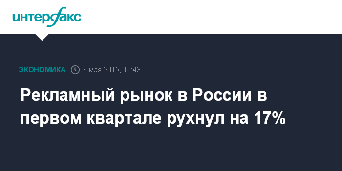 Москва. 6 мая. INTERFAX.RU – Российский рекламный рынок в первом квартале 2015 года сократился на 17% по сравнению с прошлогодним показателем, до 63,5 млрд рублей (без учета НДС), подсчитали эксперты Ассоциации коммуникационных агентств России (АКАР).